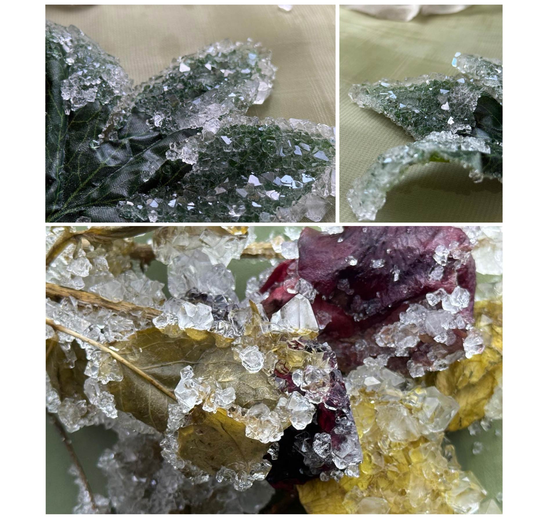 A technique where a textile scaffold is submerged in a supersaturated solution (such as alum or salt), allowing crystals to grow on its fibers as the solution cools or evaporates. This creates rigid, textured surfaces with unique crystalline patterns.
