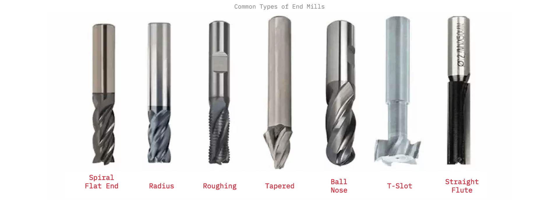 - There are multiple common types of end mills, and each one is designed for a particular cutting task: