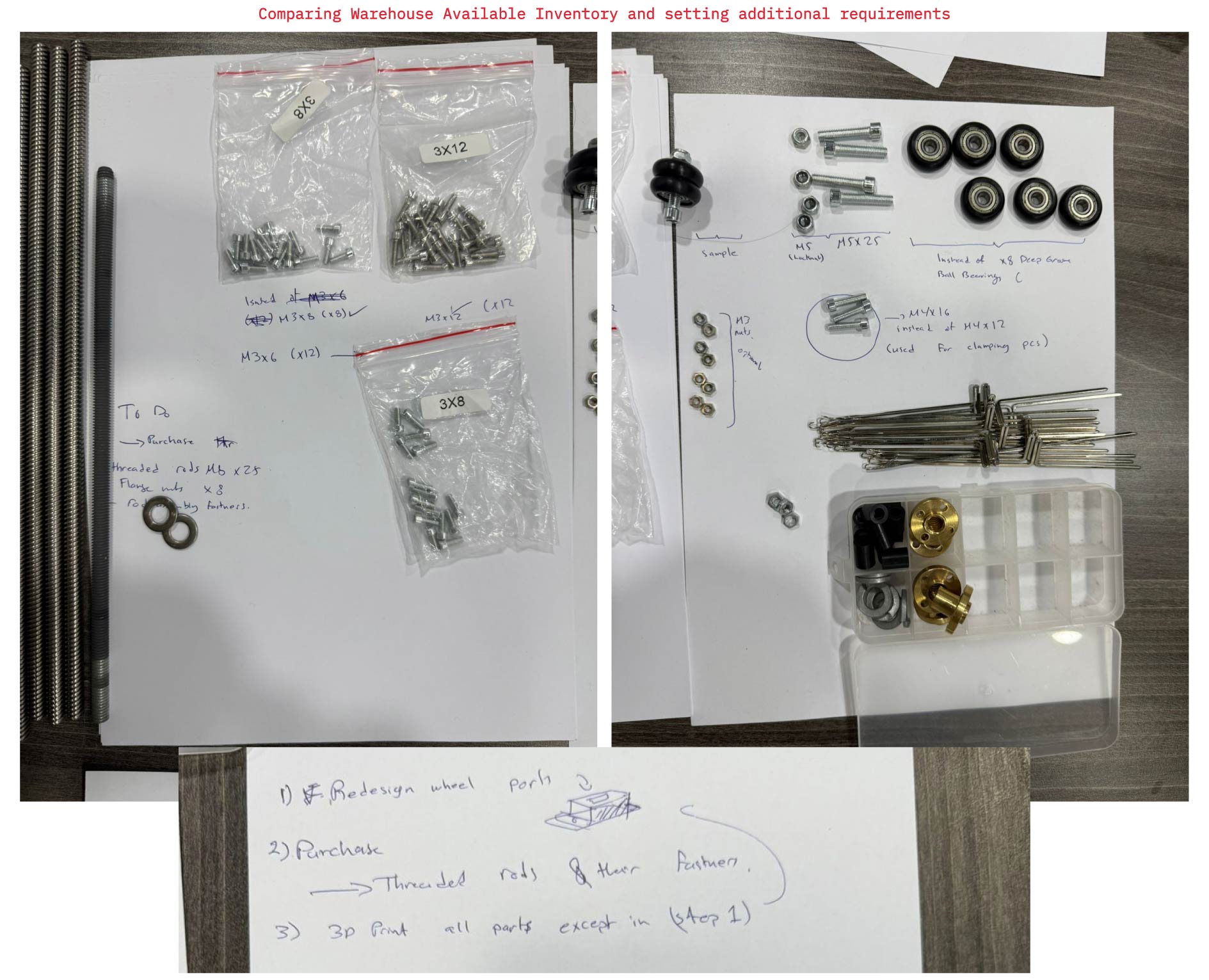 The assembly relied on two main component groups: 3D-printed parts and standard hardware.