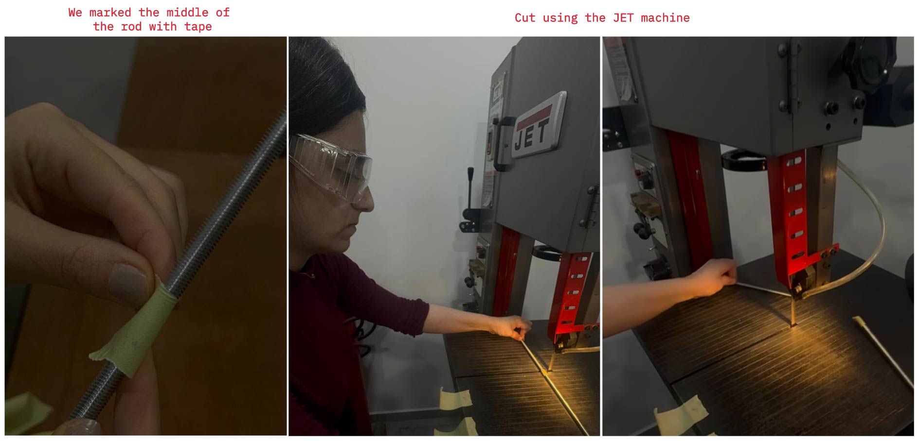Threaded rods were purchased in 1m lengths and processed into 25cm segments. Machine used for cutting: JET JWBS-14SFX 14" Steel Frame Bandsaw