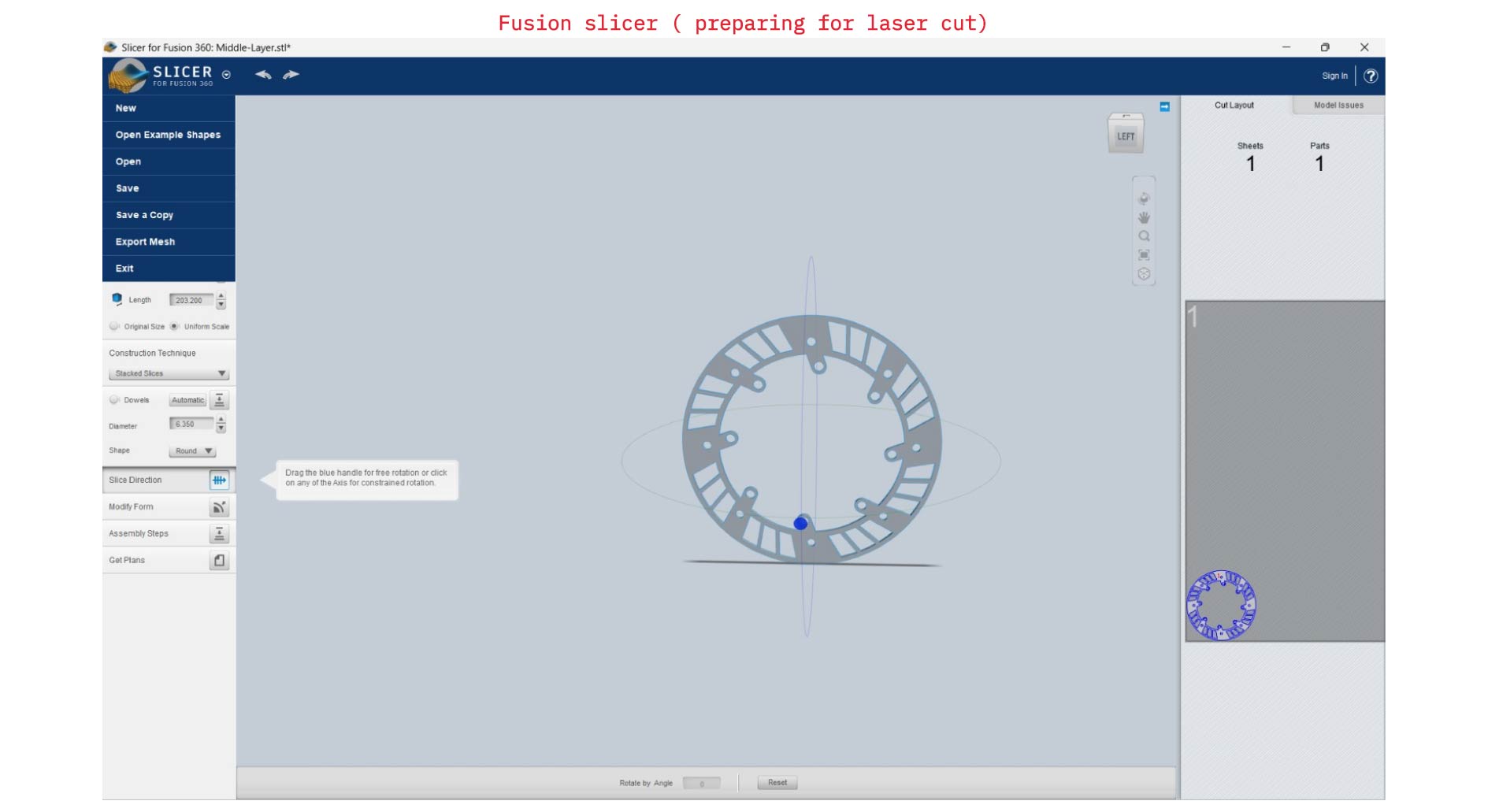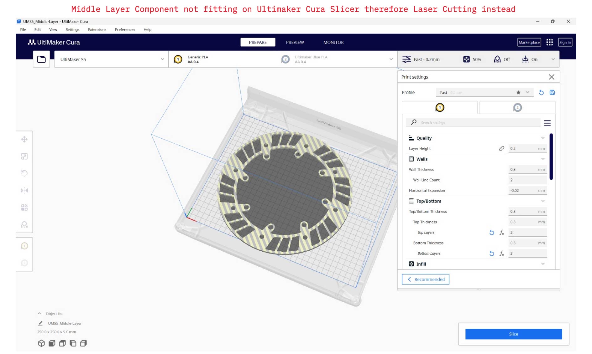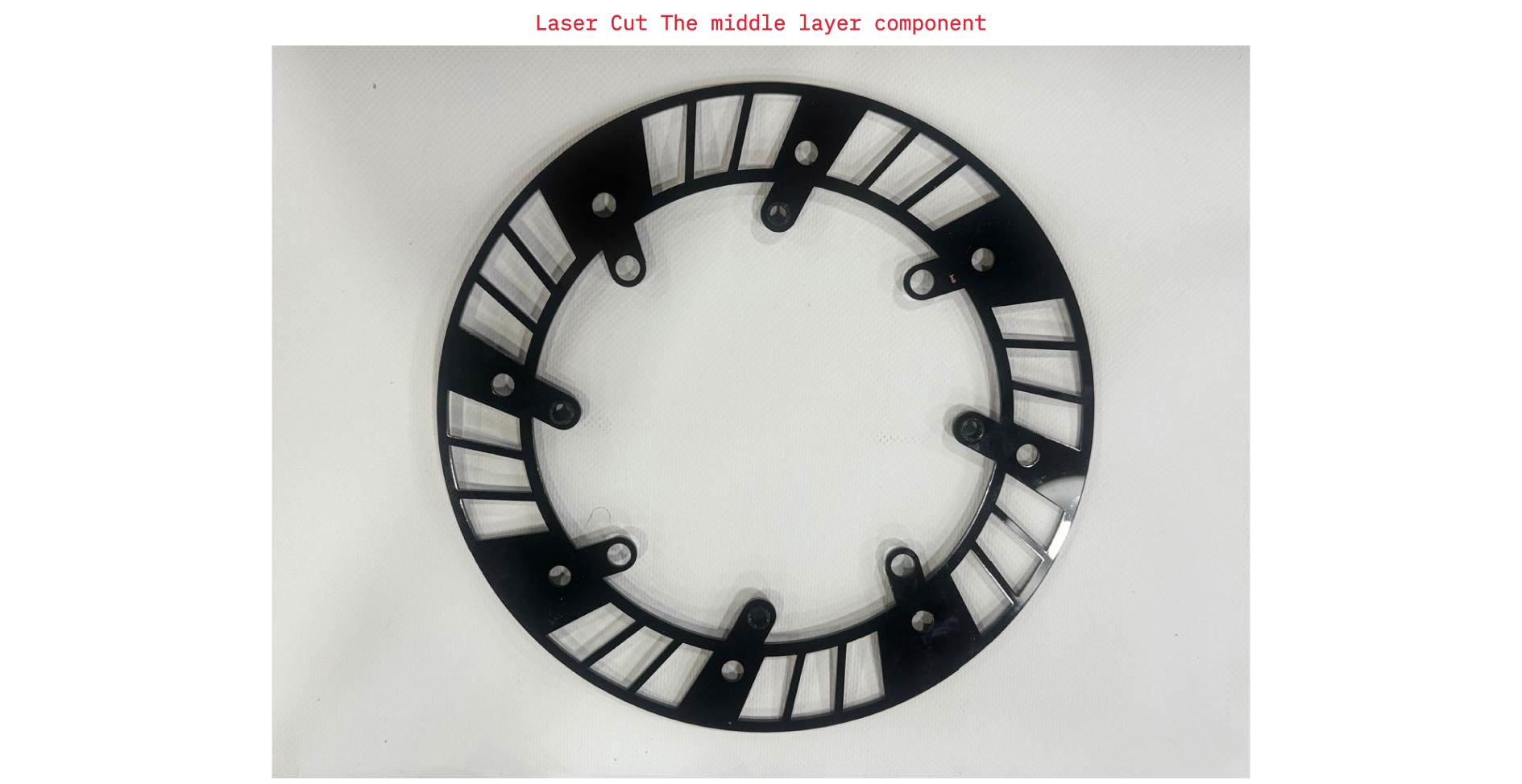 Certain components were fabricated by laser cutting instead of 3D printing, either due to their larger scale or the improved accuracy offered by the laser cutter. These include: Middle Layer Component, The Gears.