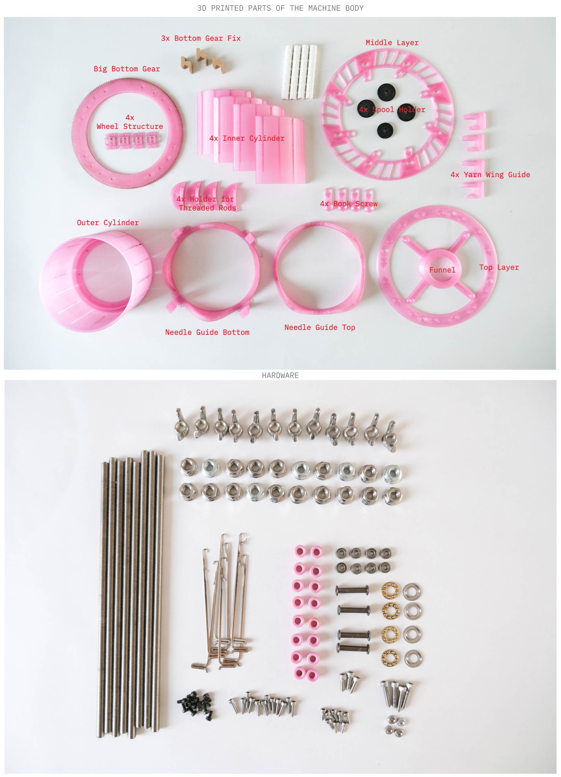 We started off by following the Visual Building Instructions by Jasmine for the multi-yarn circular knitting machine, then reviewed and downloaded the available STL files from her GitHub Repository preparing the digital assets for local production.