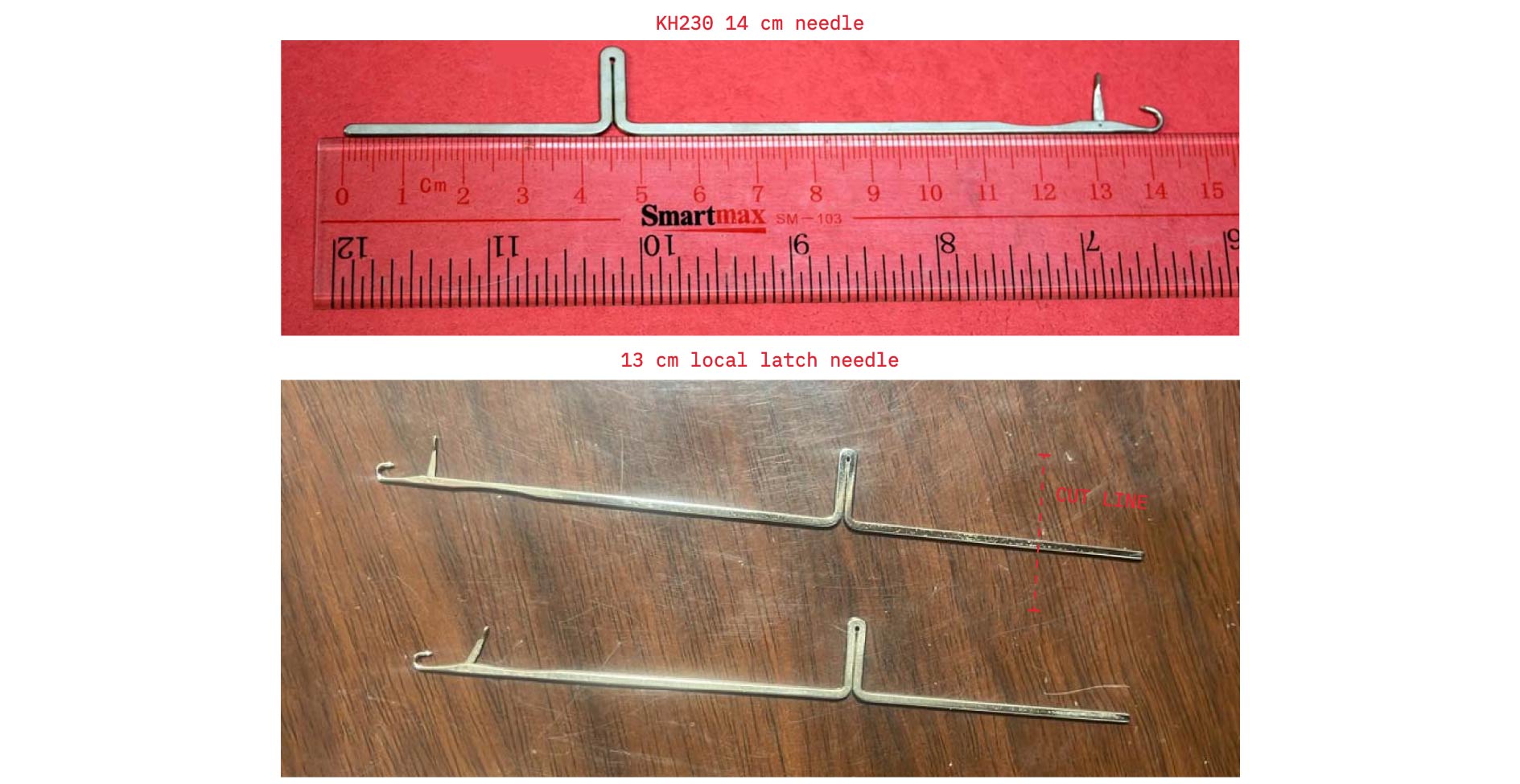 The original design called for the Brother KH230 14 cm needle, we used a locally available alternative that was 1 cm shorter. This difference did not affect functionality, as the needles needed to be further trimmed by around 2 cm for the machine.