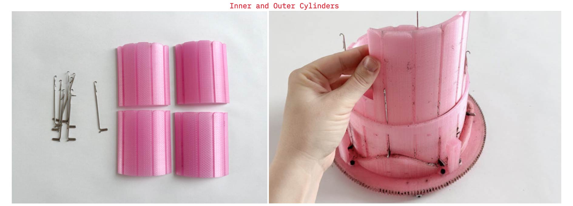 The Macro Yarn Machine is an open-source textile fabrication system developed for producing large-scale yarn structures. It knits around a central core and can feed multiple yarns within a single row. The mechanism is driven by a spur gear that carries the rotating assembly, while the cylinder group remains fixed to the work surface. As the gear rotates around the stationary cylinder containing the needle guides, this coordinated motion enables precise vertical control of the needles during circular knitting.