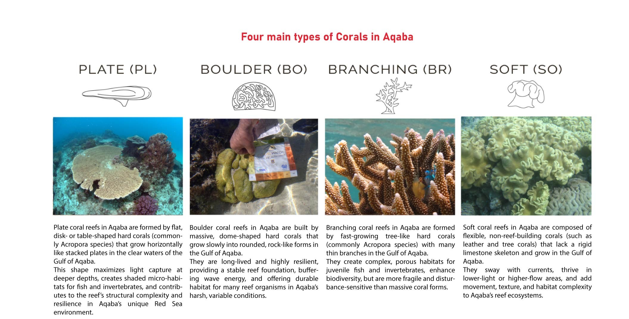 Coral reefs in the Gulf of Aqaba are composed of several structural coral types that shape the reef ecosystem and provide habitats for marine life. The following overview presents the four primary coral formations found in Aqaba and their ecological roles.