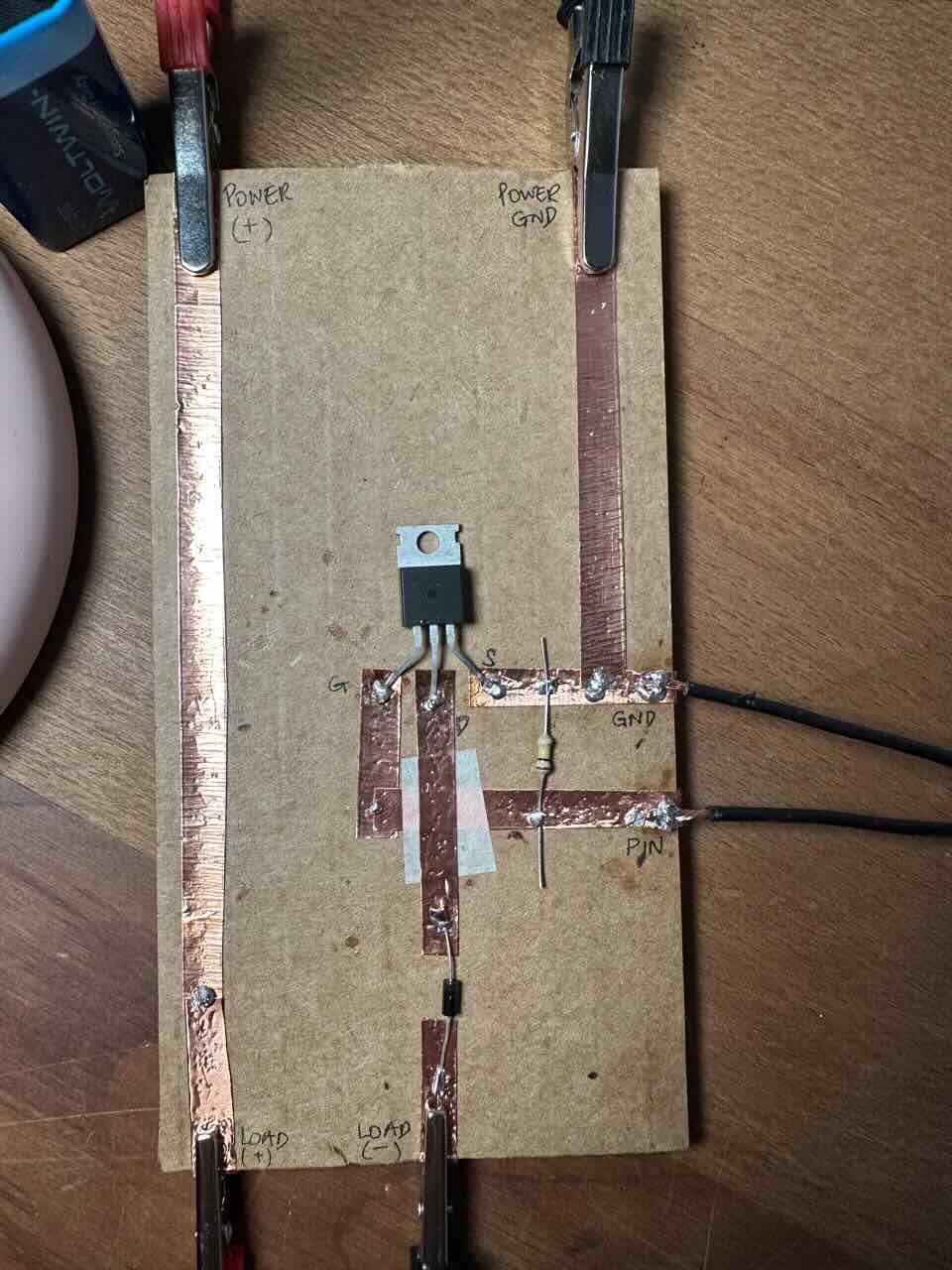 When I initially tried it, it didn't work, so I had to debug it by checking the voltage using the multimeter. I initially checked my battery to make sure that it has not died, it showed 8.9V. I checked the Gate of the transistor - which was going from 3V to 0V, showing me that the code is working. I checked the Load as well. Everything seemed to be connected fine and my alligators worked too. However my magnet was not attracting the coil.
