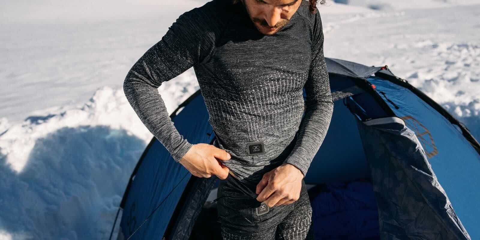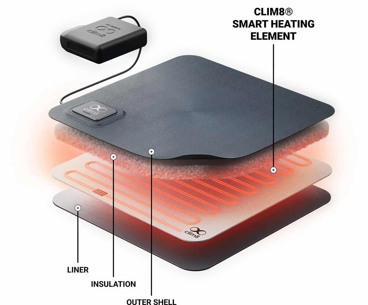 Clim8 uses a smart, sensor driven thermal system, which measures the temperature of your skin, the environment around you, your activity level and heats up your clothing according to your data profile. You can control your wearables through their application via bluetooth. It uses a battery to power it, however the data analisys is flexible and you do not need to constantly regulate it. Due to its many sensors a processor that analyses the data, it only uses the battery when you are wearing it and when you need the heat. It will automatically go to sleep when heat application is no longer needed. Flexible conductive elements are used to turn power into heat.