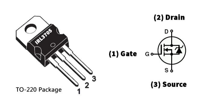 A MOSFET transistor is an electronic switch or amplifier. It has three gates - G (Gate), D (Drain), S (Source). When Voltage is applied to the Gate, it will create an electric field, which then will either open or close the path between Source and Drain. There are two types of MOSFETs. An N-channel MOSFET, which is what we will use, will conduct when a positive voltage passes through the gate. There are numerous MOSFETS and choosing the right one that will work with the Fabrixiao was a little hard to come by. The best MOSFET you can use with the Fabrixiao board RP 2040 is IRLB8721, however the closest one I could find was IRL3705. This is also an N-channel logic level with a Vgs min 1 - max 2.