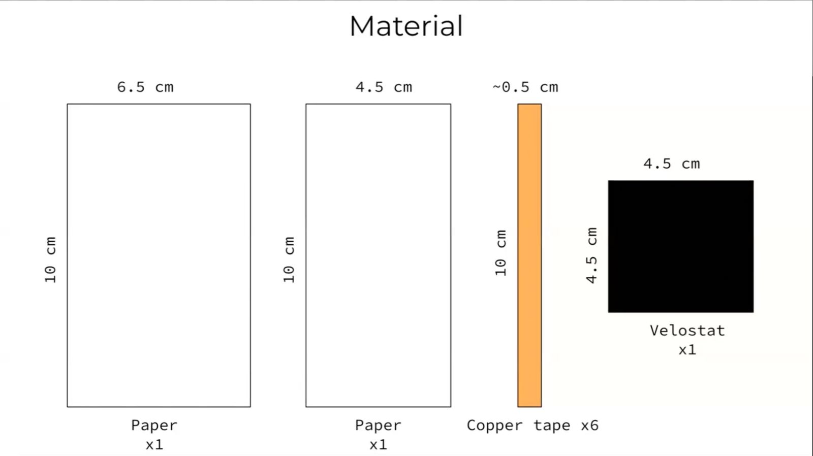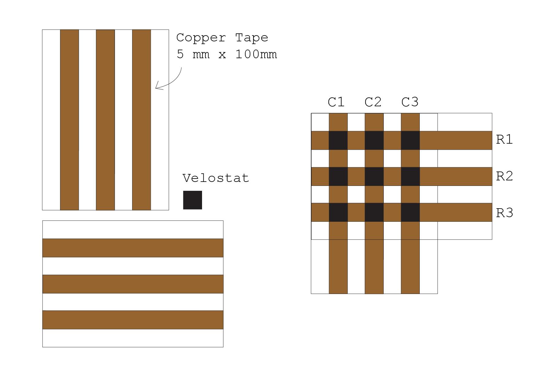 Align three of the cut-out copper tapes and stick them on one of the pieces of paper (6.5cm x 10cm), leaving 2cm empty from each side and spacing them 0.5cm apart. And do the same on the second piece of paper (4.5cm x10cm) leaving 1cm from the edges and spacing them 0.5cm apart. Place velostat in the middle.