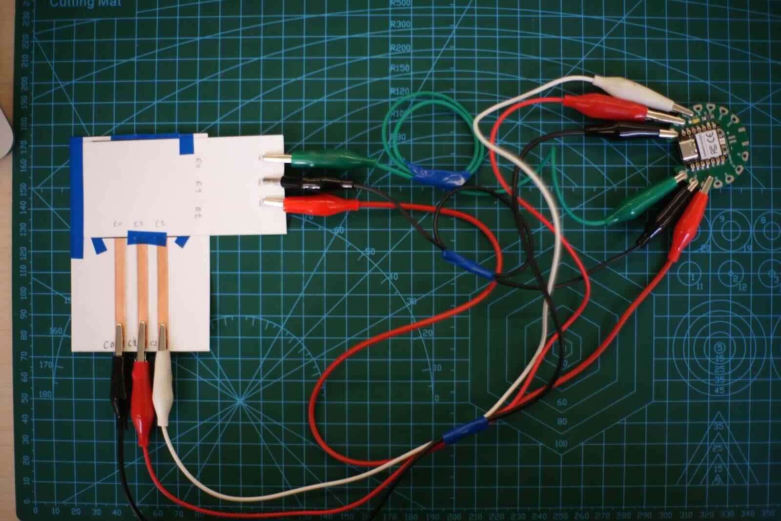Attach alligators from C1, C2, C3 to D9, D8, D7, then R1, R2, R3 to A0, A1, A2. Connect the Xiao RP2040 to the computer and Arduino IDE and run this code.