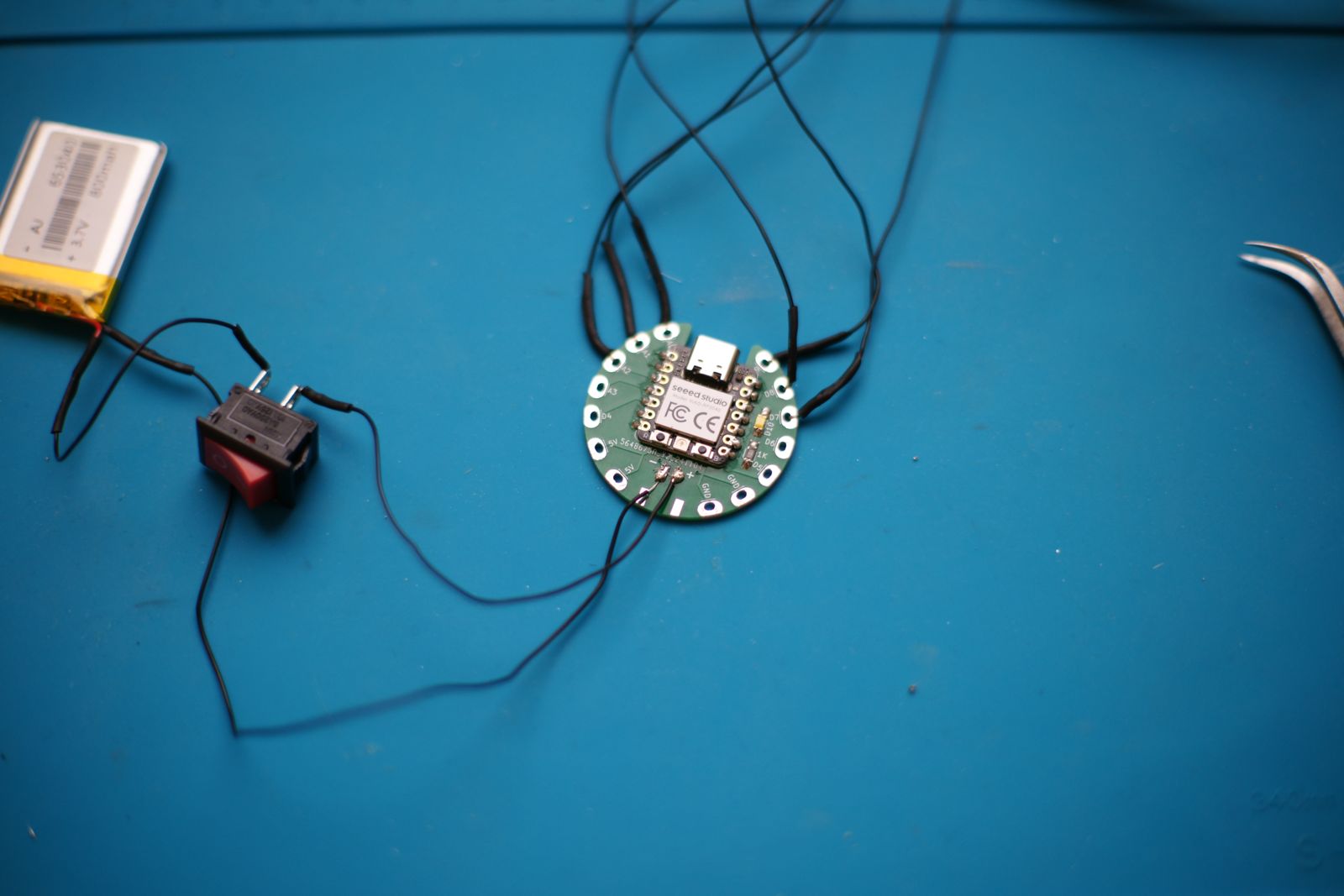 Once I was sure that it was working and my connections were good, I was ready to power it with battery. Unfortunately, we didn't have a 2 pin jet socket at the lab. What I did instead is I wired a small on/off switch to the battery and soldered the wires to the FabriXiao.