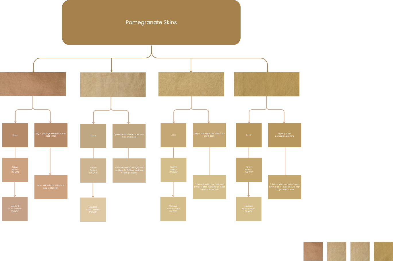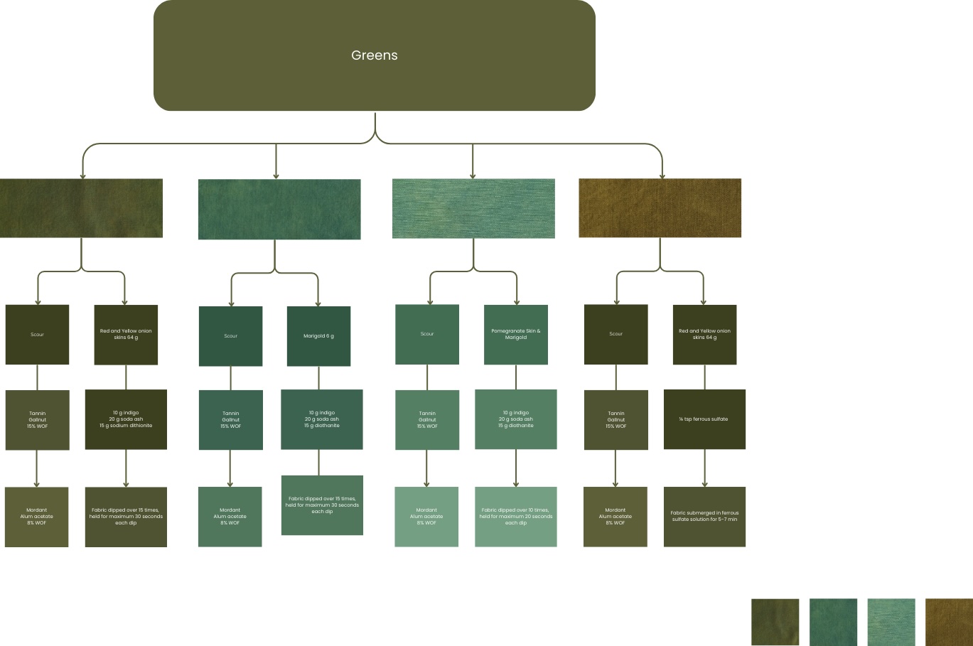 To achieve "greens" I decided to do "yellow" hues overdyed with indigo blues or modified with ferrous sulfate. I used margiold, red onion skins, pomegranate, pomegranate and marigold as you can see in the colour map below.