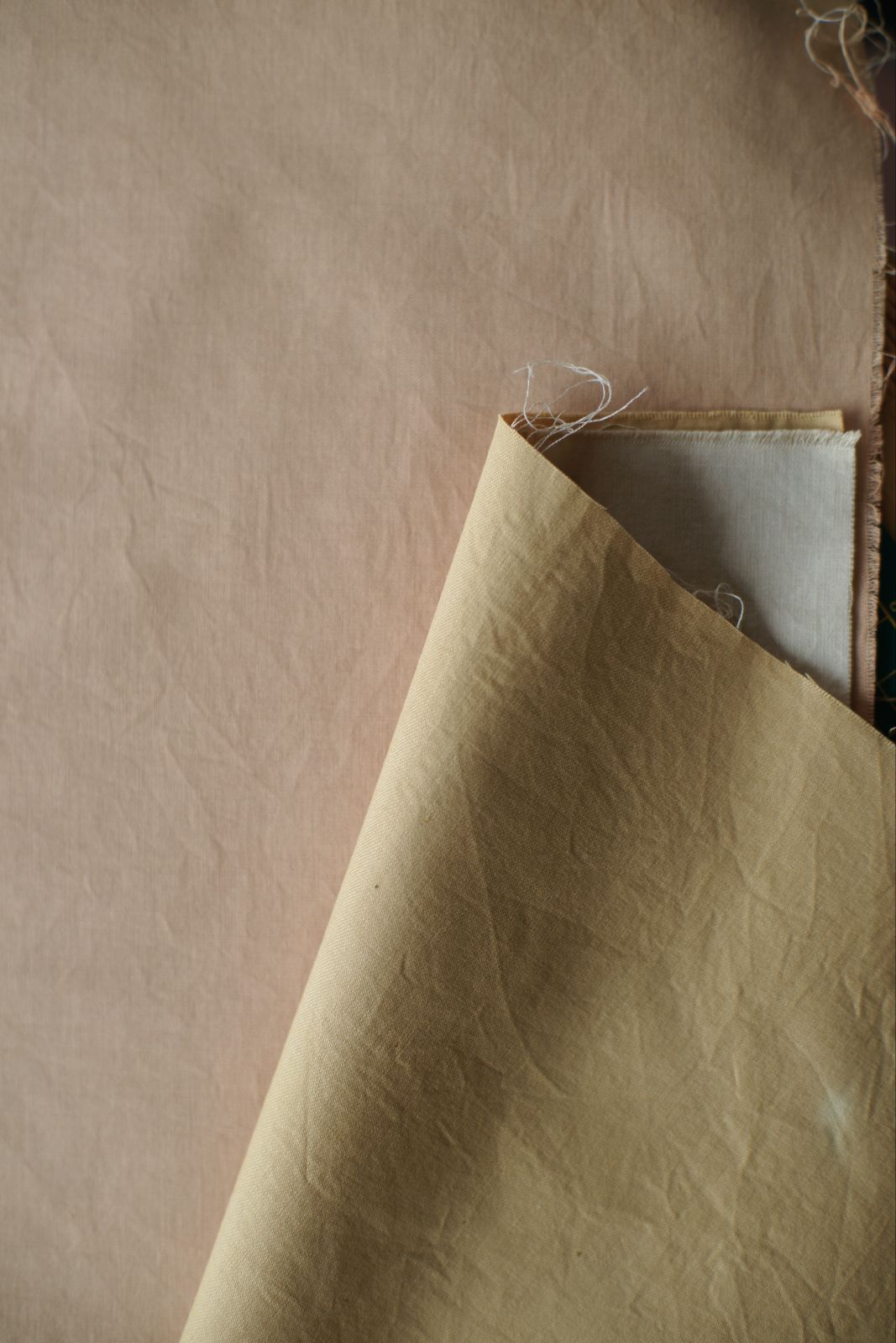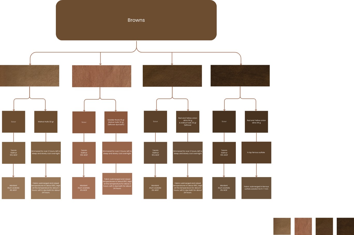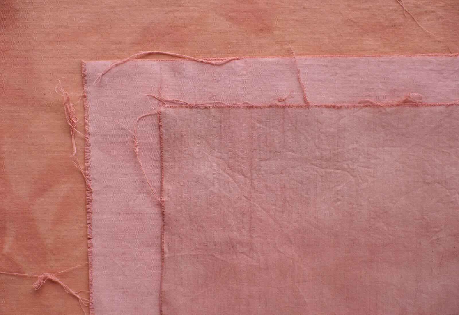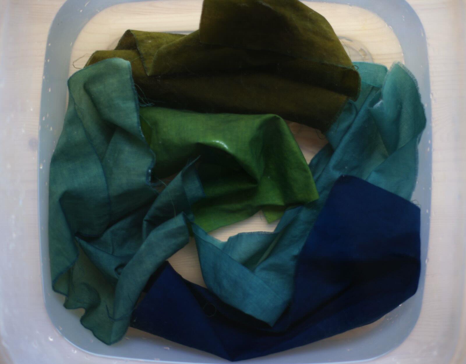 All fabrics have been scoured using soda ash and a drop of scour soap. While rinsing the fabrics after scouring, before submerging in the tannin bath, I have used a dash of vinegar in the water. Soda ash is highly alkaline and if there is even the slightest alkaline residue left on the fabric, it will mix with the tannin and turn slightly green. Using a a small amount of vinegar with water to rinse the fabrics avoids the formation of greenish hues.