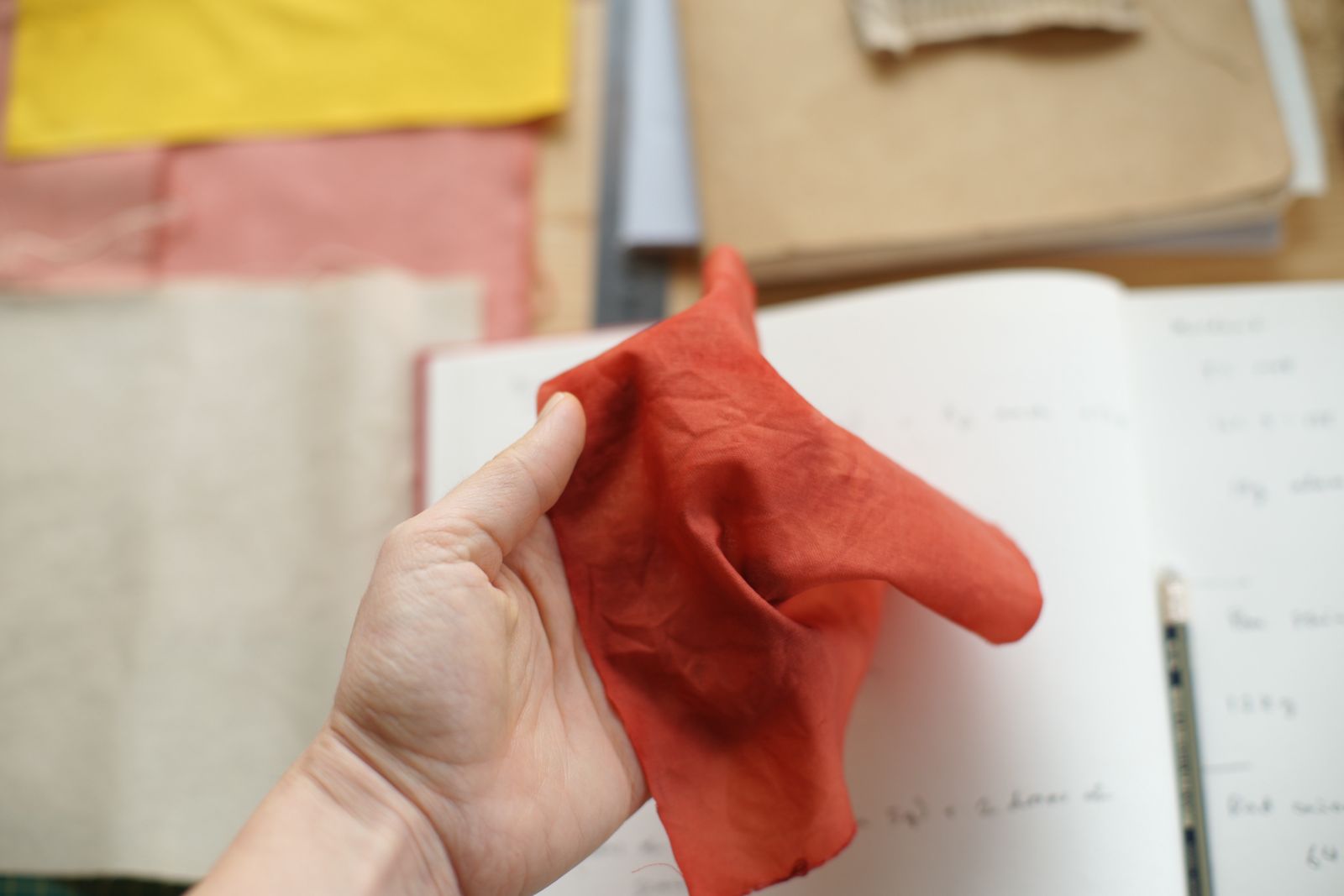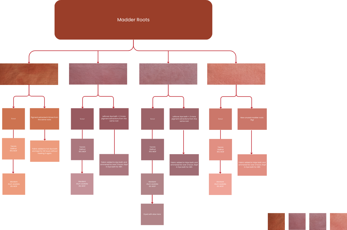 The first experiment I did to achieve "red" for my swatchbook/ research was with madder roots. For this experiment I have used 32gr of madder roots, that had been used once previously. Madder roots carry a lot of pigment and you can use the same roots many times to extract colour. Madder roots are sensitive to heat, usually advised not to raise the temperatures above 82C. For the shade of red that I wanted to achieve, I raised the temperatures to boiling point, to activate the brown pigments too. After reaching boiling point, I then simmered it for an hour. I have extracted colour from the same roots 5 times.