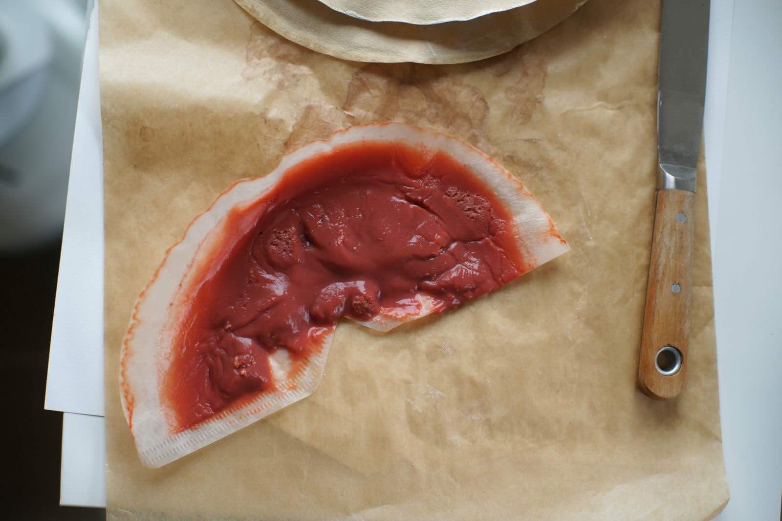 Raise the temperature of the dye bath to about 70C. Add the alum and mix so it fully dissolves. In a separate jar, mix the 200ml hot water and 5gr soda ash. Slowly add the soda ash to the dye bath. It will create foam, so best to add slowly and mix in between. Using a coffee filter, you can filter the sediment, which will dry into a lake pigment.