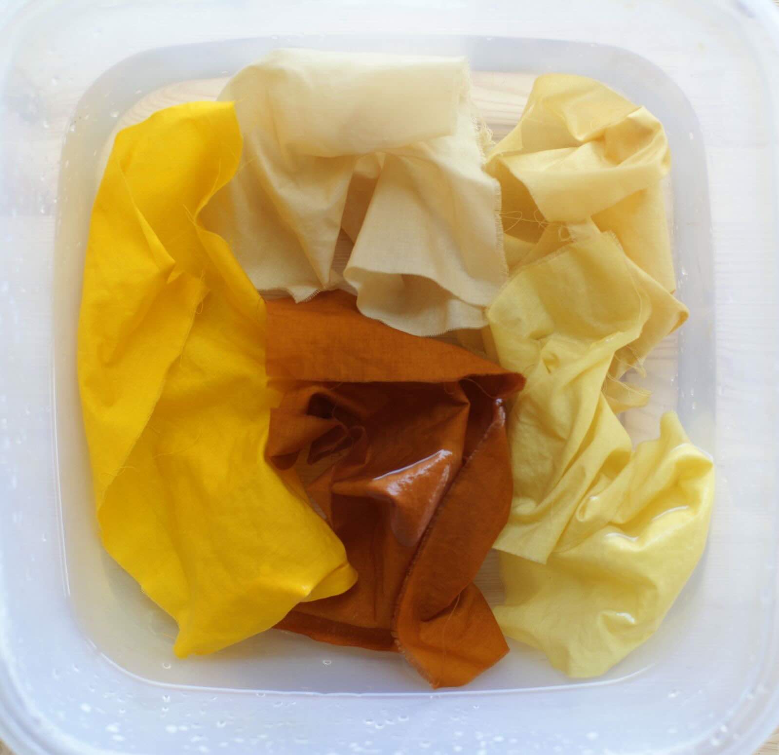 The first experiment I did for "yellow" was with 32g of freshly dried skins (year 2025-2026). I simmered the skins for over 2 hours, then immersed the pre- treated fabrics in the hot dye bath and let it cool without heating it up again.