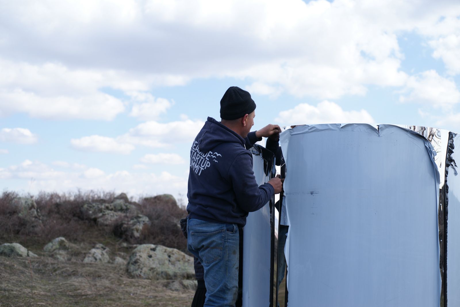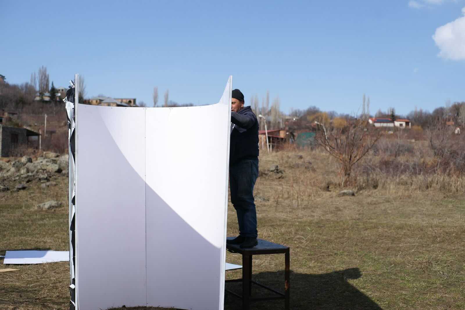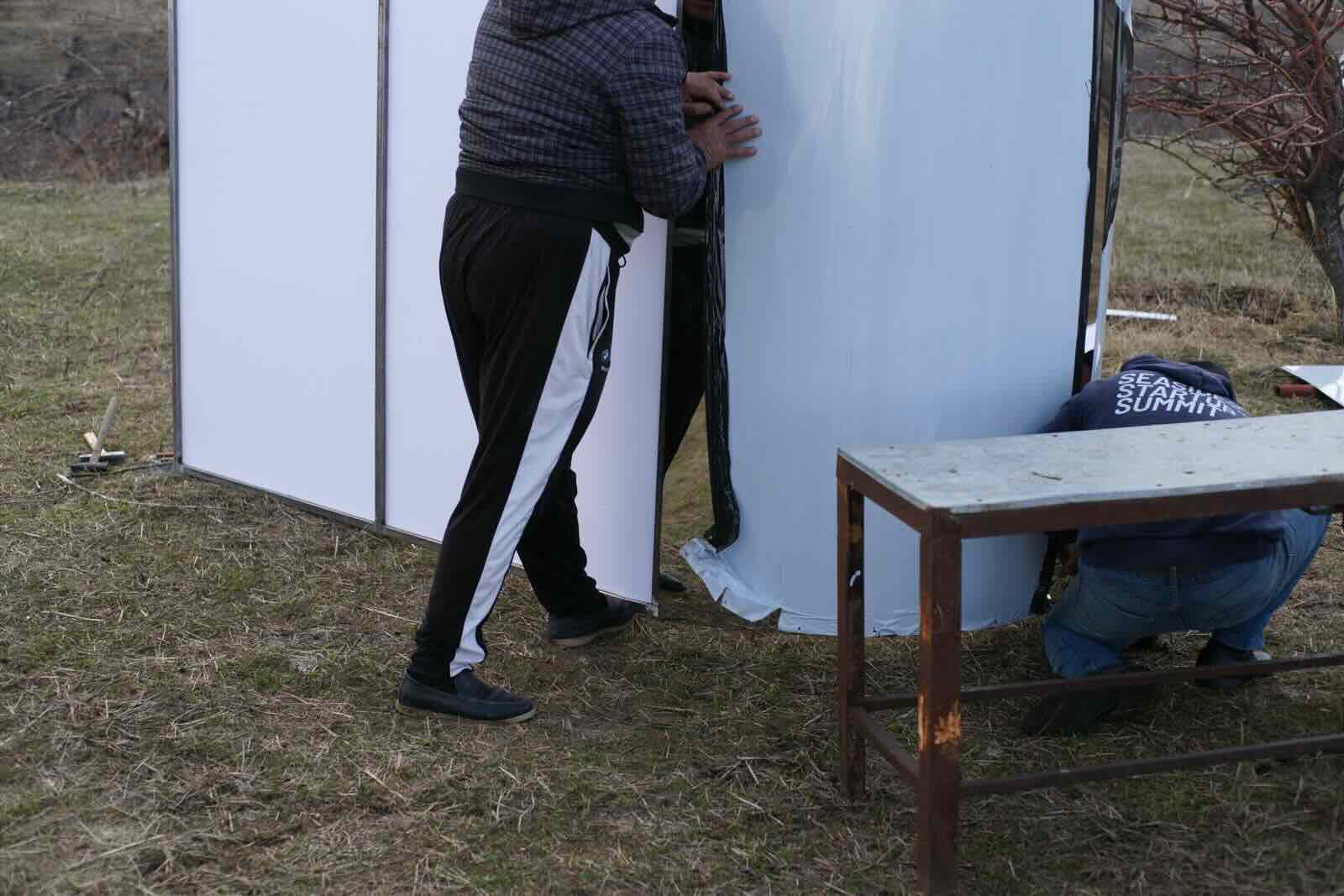 The material choice for this construction also refelcts the project as a whole. Interviews made it evident that colours reflect a person's inner landscape. I wanted the mirror metal sheets to symbolise this reflection.
