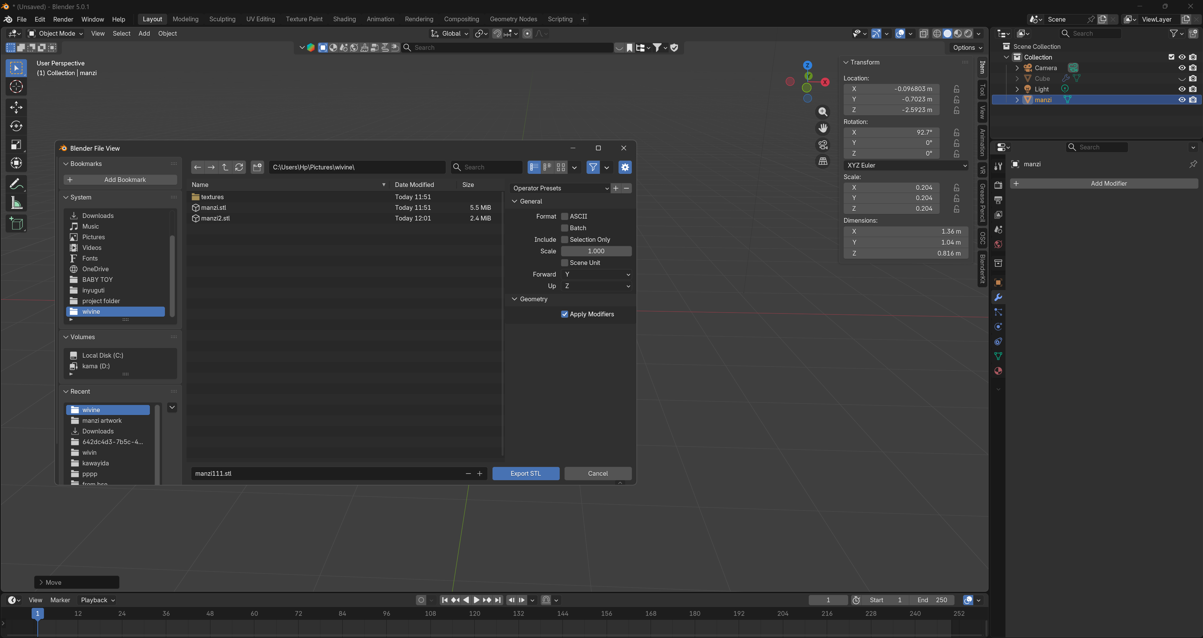 In Blender, I modified the mesh by cutting unnecessary parts and keeping only the sections required for fabrication.I cleaned the model and ensured the shapes were suitable for slicing and physical production.The edited model was exported again and imported into Fusion 360 for precise technical processing.