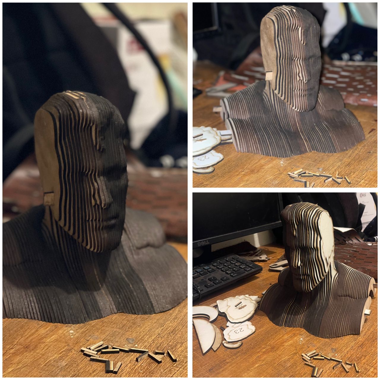 My idea was to start from a digital sculpture and turn it into a tactile object. Layering wood felt like the perfect way to reveal volume and contour while keeping that heroic look.