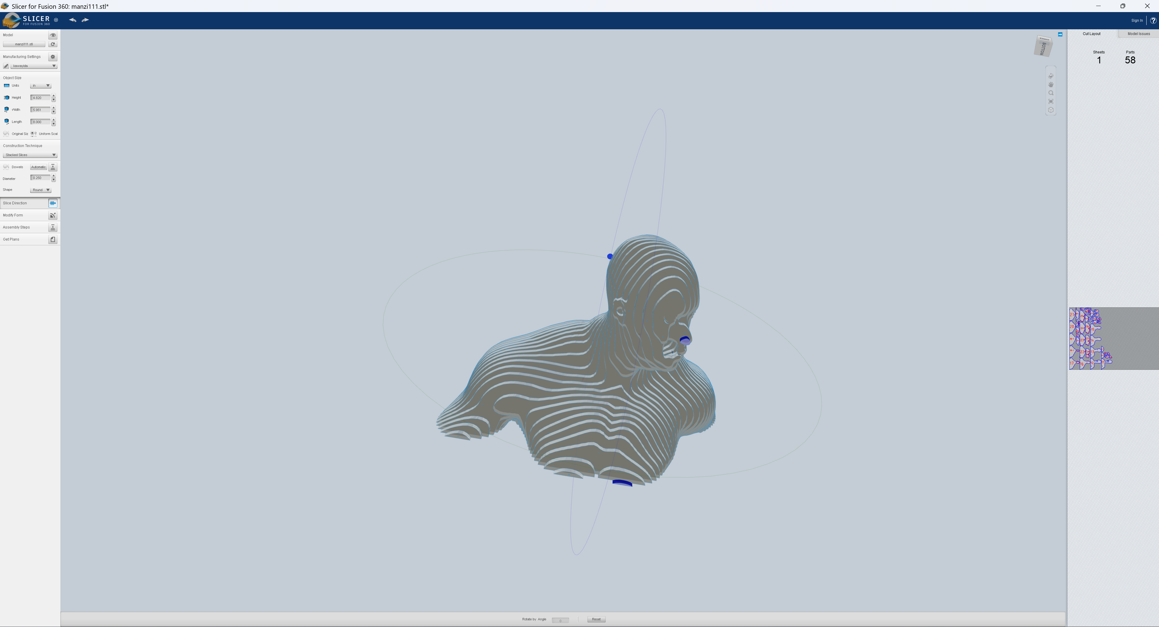I created slices optimized for laser cutting, preparing the design for fabrication.