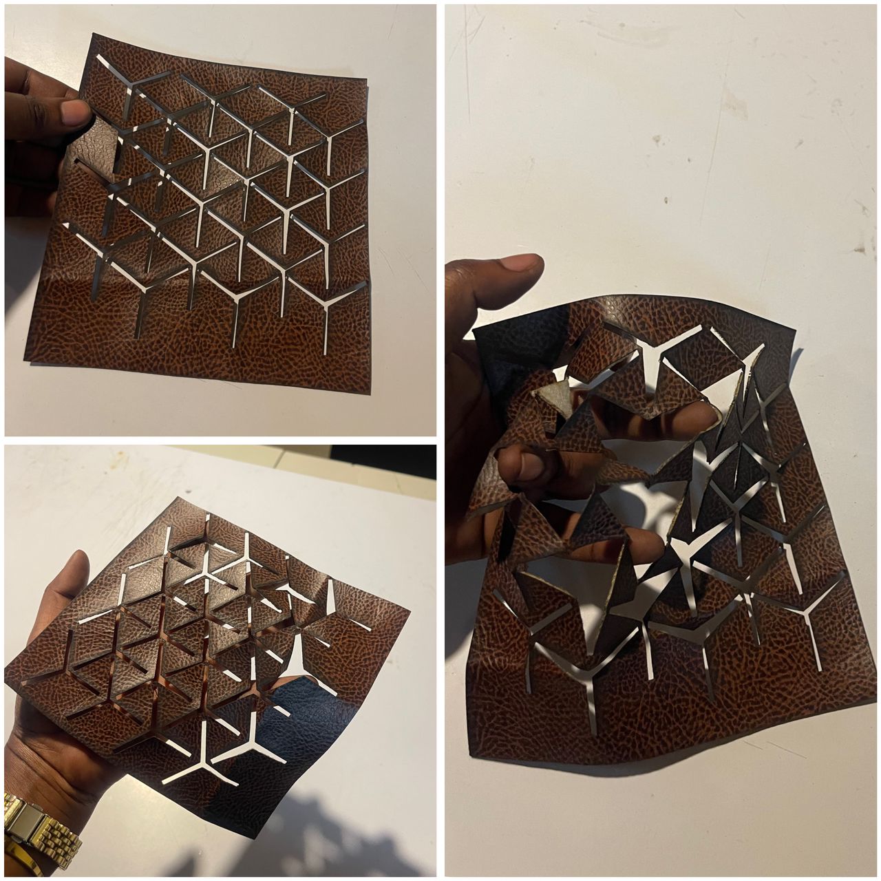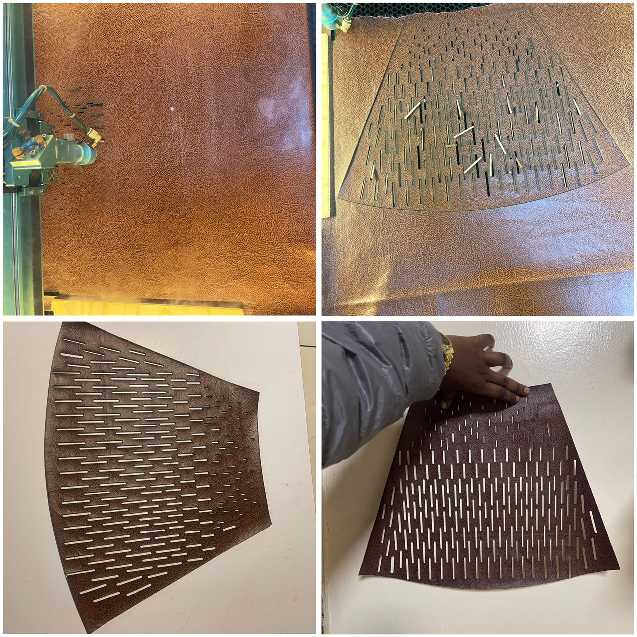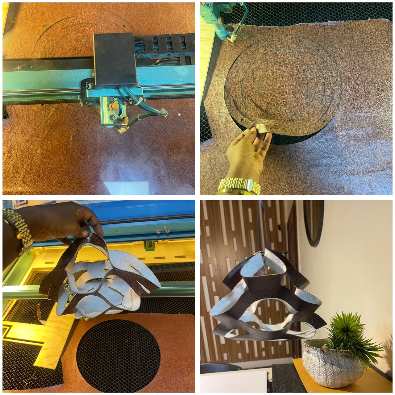 I created my patterns using CorelDRAW (curves, circles, slits, and layout). I cleaned the lines, adjusted stroke settings, and exported the file for laser cutting.I chose leather for cutting because it holds shape and reacts well to slits. I cut the patterns on the laser cutter, testing speed and power settings. I assembled and tested the pieces to see movement, flexibility, and structure.