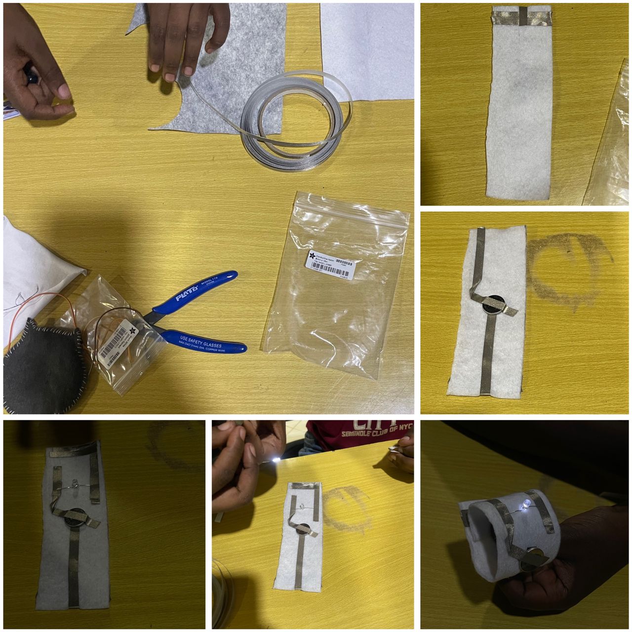 I made a simple light-up bracelet using conductive maker tape, an LED, and a battery. I connected the tape to form a basic circuit, making sure the LED and battery were placed correctly. When the circuit was closed, the LED lit up, showing how a simple wearable electronic circuit works.