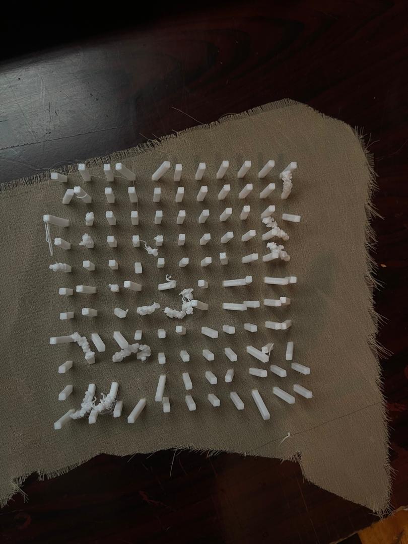 I used Blender to create a simple cube and manipulated it using basic tools and Geometry Nodes to generate multiple small pieces in an easy and flexible way. After finalizing the design, I exported it as an STL file and imported it into Cura to slice the model and generate the G-code. The G-code was then used to print the design on fabric using a 3D printer and filament.