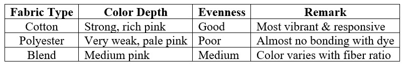 The result shows that there is color depth difference when the fabrics varies as shown in the table.